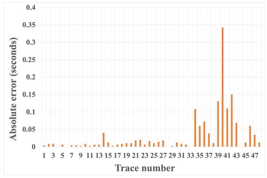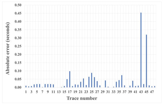 We also tested the proposed HEEH method on Yilmaz shot records 22 and 23, which are Vibroseis records [22]. These shot records contain statics owing to the near-surface complexity. There were 48 traces in each record, with 1650 samples in each trace sampled with a 2 ms sampling rate. Figure 10 shows record 22 before and after picking, using the HEEH method. Figure 11 shows a comparison between the first arrival picks of the HEEH method and those selected manually for this record. Figure 12 shows the absolute errors between the HEEH and the manual first arrival picks of this record. Similarly, Figure 13, Figure 14 and Figure 15 show the results of applying the HEEH method to Yilmaz shot record 23. Because this record has highly noisy traces (numbers 12, 13, and 38), these traces resulted in large absolute error values of up to 0.45 s. Table 2 summarizes the basic statistical parameters of the absolute error for the real dataset. The median absolute error was 10 ms for record 22, indicating a good performance. In comparison, the median absolute error was 18 ms for record 23 because of the presence of a few excessively noisy traces and near-surface complexity.