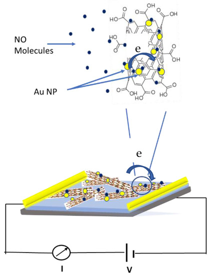 - Mubeen, S.; Lim, J.-H.; Srirangarajan, A.; Mulchandani, A.; Deshusses, M.A.; Myung, N.V. Gas Sensing Mechanism of Gold Nanoparticles Decorated Single-Walled Carbon Nanotubes. Electroanalysis 2011, 23, 2687–2692. [Google Scholar] [CrossRef]