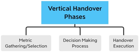 As a result, repeated VHOs would drastically lower system capacity. Similar to other hybrid networks, maintaining signal continuity requires corresponding HO techniques and algorithms. The VHO algorithm can be designed using any mathematical techniques that can be used to fit a multiple-input, single-output function, which is how the method is defined mathematically. Figure 1 [14] illustrates how a VHO process can be broken down into three parts, including metric gathering, decision-making, and handover execution modules. Decision-making, also known as the HO algorithm, is the most significant step. Previous VHO algorithms can be divided into several groups depending on the mathematical techniques employed, including fuzzy logic (FL), Markov decision process (MDP), game theory (GT), and machine learning (ML)-based algorithms [14]. It is necessary to simulate the algorithm to assess its performance after choosing the appropriate mathematical tool to model the VHO problem.