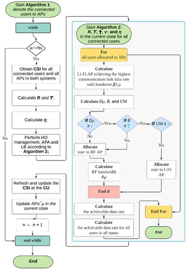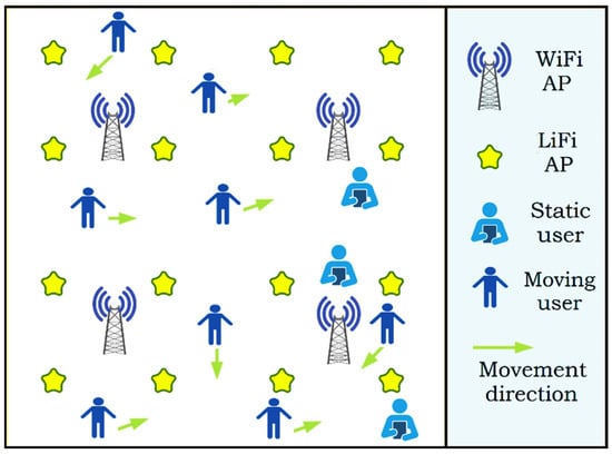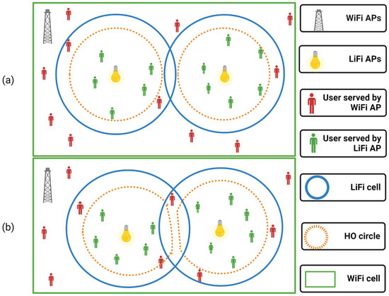 Hybrid networks have the potential to raise network performance, though when user mobility is factored into the equation, load balancing (LB) concerns and the consideration of correct HO decisions become more difficult and complex. This is because the WiFi AP typically has a lower capacity than the LiFi AP [15] but a wider coverage area. To prevent inter-cell interference in a homogeneous network, the overlapped coverage among LiFi APs must be abridged, then the LB process would not be necessary. As a result, the signal strength strategy (SSS), which places every user with the AP that has the strongest received signal strength, is frequently utilized in homogeneous networks. As a result, if the SSS approach is employed, a WiFi AP would be able to serve more users than a LiFi AP. The WiFi system becomes vulnerable to traffic congestion as a result. Therefore, employing the SSS would easily cause the WiFi AP to become overloaded. LB with VHO and HHO is necessary for the reasons listed above.