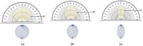 2-D and 3-D views of LED source radiation patterns, (a) φ1/2 = 60°, (b) φ1/2 = 40°, and (c) φ1/2 = 20°.