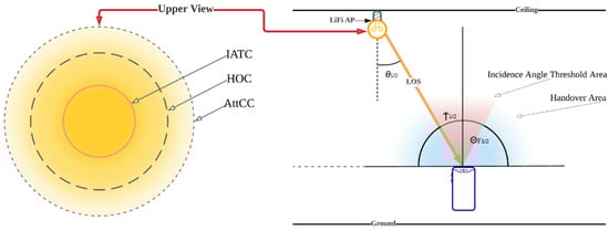 Figure 4 shows the HO circle (HOC), which refers to the service area with high optical gain; the attocell circle (AttCC), which is a critical area with low optical gain; and the incidence angle threshold circle (IATC) where the highest optical gain resides. All these elements are considered in this study for the decision process of the proposed method including DRT, IAT, and UMT, as will be discussed later in this section.