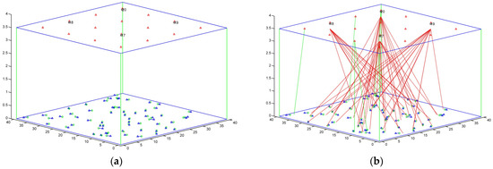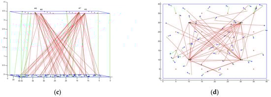 All of the LiFi APs reuse the same bandwidth, and the CCI between adjacent LiFi attocells is treated as noise. All of the users are distributed evenly and relocate at arbitrary speeds ranging from 0 to 2 m a second. Figure 8 depicts an example of simulation execution: Figure 8a depicts the beginning of the simulation, while Figure 8b depicts how users are assigned to the available APs, with the connection represented by red and green dashed lines. The red lines are WiFi signals, and the green lines are LiFi signals. Moreover, Figure 8c,d show another side view and upper view, respectively.