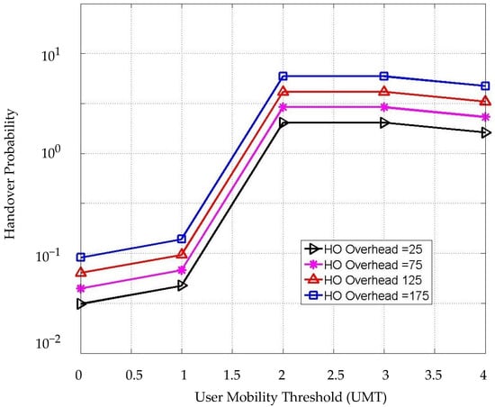 The HO probability is achieved by corresponding to the UMT with different HO overhead values as shown in Figure 10. It can be seen that the HO probability increases concerning the user mobility threshold ⱱ and the HO overhead. A 50 ms delay of HO overhead has been considered in this simulation leading to an approximately 3 dB increase of the HO probability when the UMT is 1 m/s. In addition, the HO probability increases significantly right after the speed of the user is more than 1 m/s. This process is a vital part of the decision process because it represents the third-step condition as a final check before making the HO process. The HO overhead does not have a significant impact on the HO probability in our scheme since the process focuses on the values of , , and ⱱ. When the value of ⱱ ≤ 1, the value of HO probability is still low. On the other hand, the HO probability will be high enough to trigger the HO with the increment of UMT, and it becomes stable when it reaches 2 m/s and higher, which means the user would be assigned to WiFi, and the HO is skipped. In this case, changing the value of and/or would not impact the HO decision. However, the data rates and load on each AP will dynamically be changing.