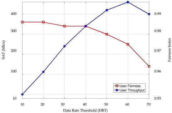 In Figure 11, the average system throughput (SAT) and user fairness are considered concerning the data rate threshold (DRT). Here, a fairness index is applied to evaluate user fairness [13], which can be expressed as: