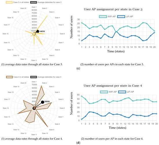 Figure 12c presents Case 3, the highest data rate achieved was 74,457 Mb/s during the third state, while the lowest data rate was 114 Mb/s during the seventh state. Finally, in Figure 12d, the highest data rate was 69,716 Mb/s during the second state, whereas the lowest was 86 Mb/s in the first state. In addition to all the aforementioned results, the average data rate for the total time (20 states) was 1113 Mb/s in Case 1, 3591 Mb/s in Case 2, 14,018 Mb/s in Case 3, and 30,958 Mb/s in Case 4.