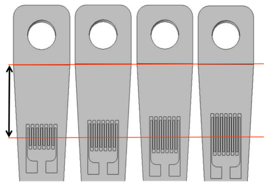Four different lengths and thicknesses of sensitive layer films were designed. A strain gauge with a total resistance of 120 Ω was created to match the XL2101B2 static strain gauge and to ensure that the widths of the transverse, electrode, and longitudinal grid zones were constant. Using Solidworks modeling and simulation analysis, the sizes of the sensitive layer functional areas were calculated (Table 1) using the boundary probe of the simulation software to monitor and compare the output strain value of the substrate surface. To avoid inaccurate strain output results due to design errors in the substrate, the midlines of the longitudinal grids of the four sensitive layers were made sure to coincide with the same intercept line of the substrate (Figure 3). Table 2 shows the physical parameters of each functional layer material of the TFSG.