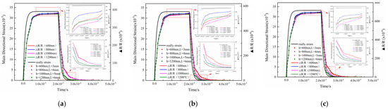 In order to obtain a complete loading and unloading strain pulse signal, a force of 25 N was applied to the substrate. Figure 4 depicts the hysteresis error of the strain transfer at different temperatures with different film thicknesses and gate lengths. There were errors in the loading and unloading process due to the lag of the strain transmission. When loading, the simulated strain output of the sensitive layer with a thickness of 800 nm was almost identical to that of the substrate surface. In comparison, the strain error of the sensitive layer with a thickness of 1000 nm was relatively large. When unloaded, the shapes of the strain curves of the sensitive layers with thicknesses of 800 nm and 1200 nm were similar. When the unloading temperature exceeded 200 °C, the simulated strain output values were close to the actual strain output values. When the unloading reached a steady state, the strain transfer error of the sensitive layer with a thickness of 600 nm grew steadily with increasing temperature. The strain transfer error of the sensitive layer with a thickness of 600 nm was the largest.