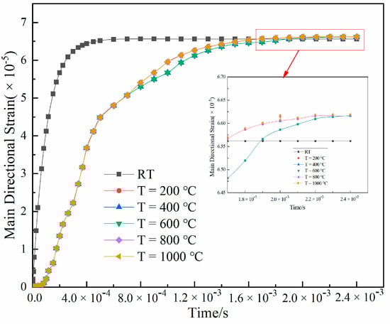 A minimum force of 5 N was applied to the Inconel718 high-temperature nickel-based alloy equal-strength beam to better observe the variation law of the strain output at different temperatures. As shown in Figure 6, after 1.6 × 10−3 s, the strain output at different temperatures was significantly different. The change in strain output at room temperature was faster than in the temperature range of 200 °C–1000 °C. Between 6.0 × 10−4 and 1.6 × 10−3 s, the corresponding strain outputs of 200 °C and 600 °C were lower than at 800 °C and 1000 °C. The strain values at different temperatures tended to be gradually stable over time. The difference between the corresponding stable values at different temperatures was ±0.05 × 10−5.