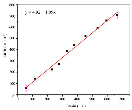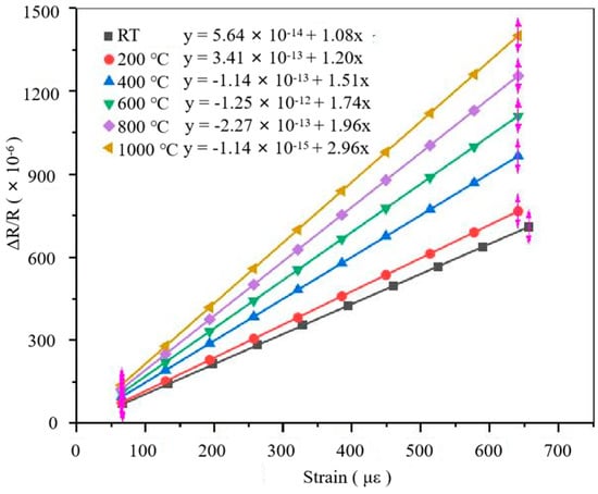 As shown in Figure 7, the / vs. curves of the PtRh6 TFSGs at different temperatures were fitted, and their GF was 1.08 at room temperature and 2.19 at 1000 °C. The main reason the GF increased with the increase in temperature was that the resistivity increased with the increase in temperature, increasing the resistance change.