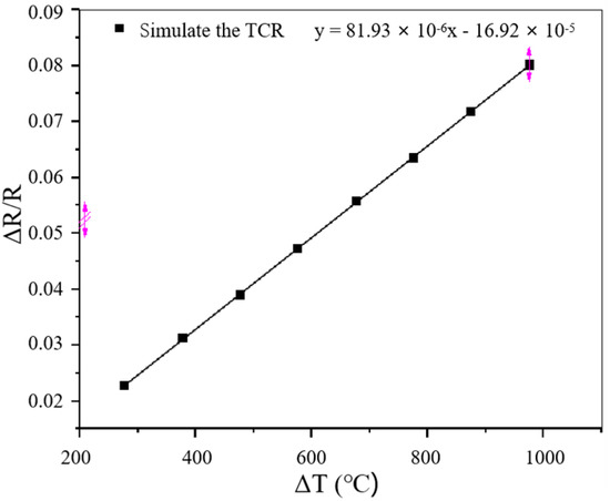 The TCR is another critical parameter of a TFSG and directly affects the accuracy of the output result. According to the simulation data in Section 2.5, the simulated TCR of the PtRh6 high-temperature TFSG was fitted. The results are shown in Figure 8. The TCR of the TFSG was 81.93 ppm/°C. The expression for the TCR is