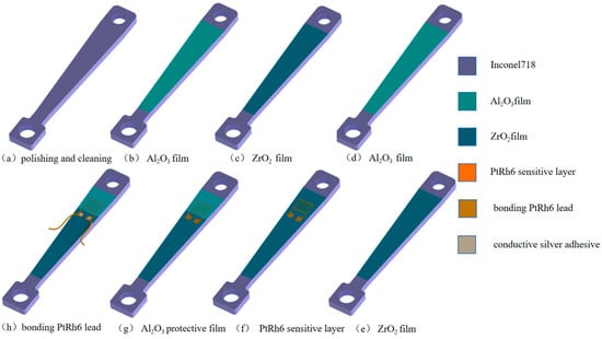 A PtRh6 high-temperature TFSG was prepared on the surface of an Inconel 718 high-temperature nickel-based alloy. The preparation process is shown in Figure 9. The substrate surface was polished with 200 grit, 400 grit, 600 grit, and 800 grit sandpaper and measured using a TR150A surface roughness test and was found to have a surface roughness of 0.025 μm. The sample was placed in an ultra-high-sonic cleaning oscillator with acetone, ethanol, and deionized water for 20 min [32]. We wiped the surface with an absorbent paper towel and dried it with nitrogen. Al2O3/ZrO2/Al2O3/ZrO2 composite insulating layers were prepared on the surface of the substrate. In order to ensure a sufficient bonding force between the composite insulating layers, the composite insulating layer was heat-treated. The temperature was maintained at 600 °C for 1 h. The PtRh6 sensitive layer was prepared using the mechanical mask method and a DC pulse magnetron sputtering coater. Because of the smaller size of the sensitive grating and the lower temperature of the sputtering vacuum chamber, the TFSG quickly fell off. Therefore, an annealing treatment at 900 °C for 3 h using the mechanical mask method covered the electrode of the sensitive layer and deposited an Al2O3 protective layer of 800 nm in a DC pulsed magnetron sputtering coater. Finally, the lead wires were connected to the substrate with high-temperature conductive silver glue. The highest heat-resistant temperature of the high-temperature conductive silver glue was 1301 °C, the lead wire was PtRh6, and the lead wire resistance was about 1.45 Ω.