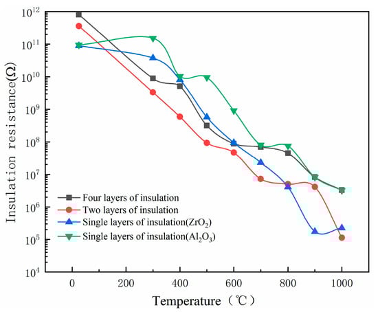 After comparing the high-temperature stability of Al2O3 and ZrO2, it was determined that the two kinds of composite insulation layers were Al2O3 films in contact with a high-temperature nickel-base alloy matrix. After the preparation of the insulating film, PtRh6 electrodes were prepared on the surface of the insulating layer and the opposite substrate surface. A platinum–rhodium wire with a diameter of 0.1 mm was used as the lead wire. In order to ensure excellent contact between the PtRh6 lead wire and the electrode, the lead wire was flattened, fixed with the substrate, coated with conductive silver glue, and placed in a Fluke9118A horizontal temperature-controlled furnace at room temperature for 24 h. The high-temperature insulation resistance test results are shown in Figure 12. We set the experimental temperature range to 300 °C–1000 °C, the temperature increase rate to 10 °C/min, maintained the temperature for 10 min every 100 °C increase, and recorded the insulation resistance value at each temperature point.