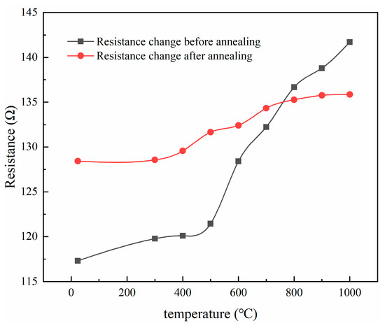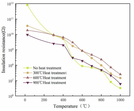 The prepared composite insulating film specimens were placed in a box muffle furnace for the high-temperature annealing treatment and annealed at 300 °C, 600 °C, and 900 °C for 3 h with a heating rate of 5 °C/min and kept for 1 h. The effects of different annealing temperatures on the insulation were compared. As shown in Figure 14, the resistance of the unannealed composite insulating film changed more obviously with temperature. The annealed composite insulating film had poor initial insulation but was less affected by temperature. After annealing at 300 °C, the insulation resistance of the composite insulating film stayed at around 1010 Ω when working from 25 °C to 400 °C, but when the working temperature exceeded 400 °C, the insulation resistance decreased; after annealing at 900 °C, the composite insulating film had a substantial fluctuation in insulation resistance only between 400 °C and 500 °C. When the working temperature was more than 500 °C, the insulation resistance at different annealing temperatures gradually appeared. Therefore, the composite insulation film after 3 h of annealing heat treatment at 600 °C had the best insulation, and the insulation resistance reached 25.8 MΩ when the temperature reached 1000 °C.