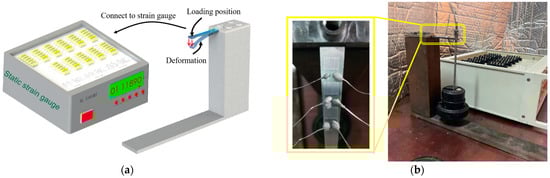The static calibration test settings are shown in Figure 15. The free end of the equal beam was loaded to 50 kg in steps of 5 kg, and the loading test was repeated three times; the average value of three results was obtained. In order to improve the accuracy of the strain output, a Wheatstone half-bridge circuit was lapped, as shown in Figure 16, and a static strain gauge XL 2101B2 was used to measure the strain, which was combined with Equation (8) to obtain the sensitivity coefficient of the PtRh6 high-temperature TFSG. As seen in Figure 17, there was an excellent linear relationship between the resistance change rate and strain. The sensitivity coefficient of the PtRh6 high-temperature thin-film strain gauge was 1.09, which was close to the simulated sensitivity coefficient of 1.08.