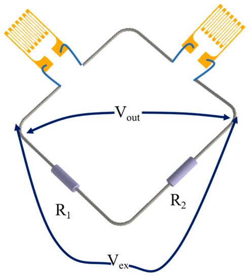 Schematic diagram of the strain transducer connected to the Wheatstone half-bridge circuit.