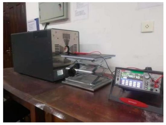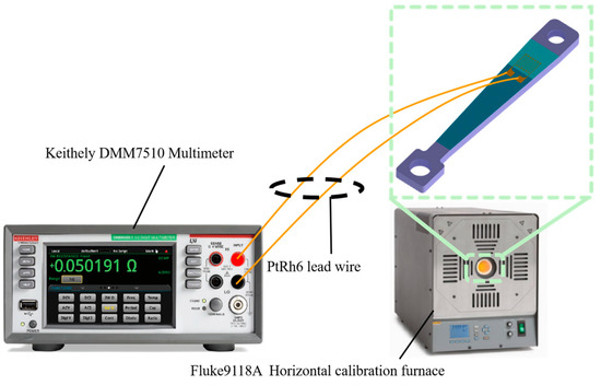 The equal-strength beam PtRh6 high-temperature TFSG samples were placed in a muffle furnace, set at 900 °C, and annealed for 3 h. The sample was placed in a Fluke 9118A high-temperature metering furnace before and after annealing. The temperature of the metering furnace was adjusted to achieve gradual heating of the thin-film strain gauge, which was connected to a Keithley DMM7510 multimeter to record the resistance value of the sensitive layers at different temperatures and the TCR coefficient calculated using Equation (9). The construction of the calibration resistance temperature coefficient experimental bench is shown in Figure 18 and Figure 19.