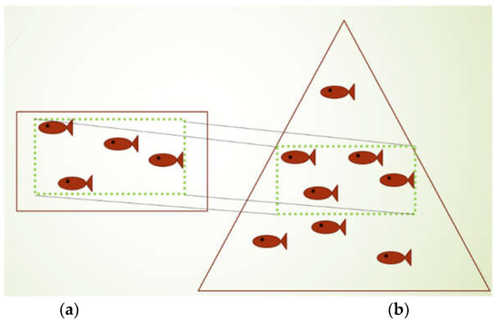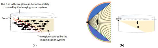 An illustration of the region covered by an imaging sonar system where (a) shows that the imaging sonar system can partly cover the fish, and (b) shows that the fish at different locations in the direction perpendicular to the sonar beam can be overlapped in the sonar image.
