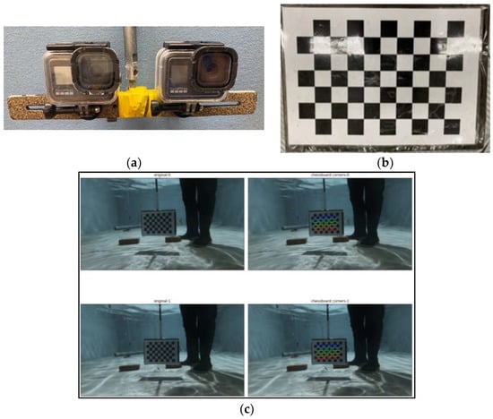 Figure 4 shows the sonar equipment we used for the image capture with GARMIN Panoptix LiveScope System (Garmin Ltd., Taiwan), which includes a sonar screen, a processor, and a sonar transducer probe. The sonar system uses an Intel NUC minicomputer (Intel Corporation, Santa Clara, CA, USA) to collect and analyze the sonar images enclosed with the sonar block box. Meanwhile, we used a low-cost camera to set up our stereo camera system using two Go Pro Hero 8 devices (GoPro, San Mateo, CA, USA). The two cameras were mounted in a fixed relative position, as shown in Figure 5a, with a baseline or camera distance of 11 cm. A waterproof case was used to cover the two Go Pro cameras to protect them from water damage since they would be submerged in the water during the data capturing. Next, we calibrated the two stereo cameras using the popular checkboard-based method, as shown in Figure 5b, since the patterns are distinct and easy to detect. The calibration checkboard has an A4 paper size with a 2.5 cm grid size. The first step of the sensor fusion relies on the stereo image rectification process of the left and right images of the low-cost stereo cameras. One potential problem of a low-cost stereo image camera system is that it is incomplete or incorrectly synchronized, causing the object’s pose to be different in the left and right images. As seen in Figure 5c, the checkboard corners serve as the corresponding points of the left and right images.