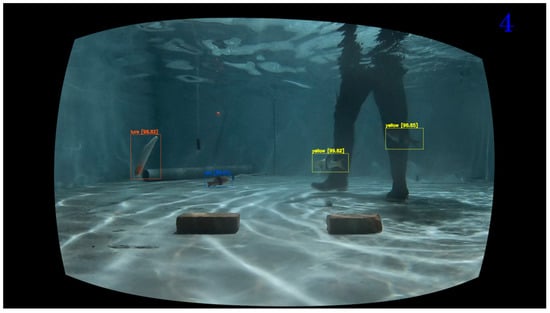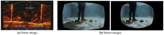Figure 7 shows the scheme for the sensor fusion that captures underwater images from a fish pond or a net cage. The 3D point clouds of the common object in the left image and the sonar image can be used to calculate the transformation matrix using a 3D affine transformation algorithm [54]. In the training phase, the common object was detected by applying the pre-trained object detection CNN, e.g., YOLOv4 [55] to both the synchronized RGB image and the sonar image. As shown in Figure 8, the bounding boxes of the common object (the brick) were detected from the stereo images and the synchronized sonar image using YOLOv4.