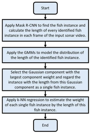 One of the AI functions is to estimate the length and weight distribution of the fish in an indoor aquaculture tank. The main challenge of the first method is that the fish in the aquaculture tank are often crowded and overlapped in sonar images. Besides, sonar images of an aquaculture tank are usually noisy due to the echo from the air pumper and the bottom and wall of the tank. The Mask R-CNN [61] identified single fish instances in sonar images. Therefore, it may locate overlapped and incomplete fish for crowded aquaculture tanks as single fish instances. Because Mask R-CNN determines the fish instance, which looks like a single fish instance, an assumption that the length distribution of identified instances is a mixture of Gaussians and the length distribution of the valid single fish instance is the largest Gaussian component of this mixture of Gaussians. Based on that assumption, the first method employs Gaussian mixture models (GMMs) to model the length distribution of the fish instance identified by Mask R-CNN. Then, the proposed method regards the fish instance with the length from the Gaussian component with the largest mixture component weight as a single fish instance and estimates the weight of the instance by the k-nearest-neighbor regression. Since we manually measured the fish fork length as the basis for the length estimation, our proposed estimation method is biased since the fork length is usually more significant than the standard length.