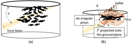 Illustration of the net cage and the fish school with the imaging sonar system, where (a) is the angle between the water and the plane of the sonar beam is ; and (b) is the feeding fish school showing is grabbing pellets during feeding which is enclosed by an irregular prism.