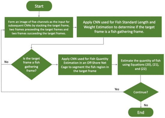 The second AI function for sonar images estimates fish quantity in an off-shore net cage, and we identified two main challenges. First, the fish considered in this paper, which were Trachinotus blochii, are often widely distributed in the net cage. Second, the view of an imaging sonar system only covers a small portion of the net cage. Since the fish of the target species can gather and swim close to the water surface to grab food pellets, the proposed method only estimates the quantity of fish in the net cage when feeding fish. The number of fish is assessed on the average fish volume and the fish school’s estimated volume and density. In this paper, a convolutional neural network was developed to determine if fishes gathered and were grabbing food pellets. Then, we supposed that the fishes gathered and were grabbing feed. In that case, a semantic segmentation network was applied to segment the fish school in the sonar image, and the volume of the fish school was estimated on the segmentation result. The visible imaging has a short imaging distance underwater due to the light attenuation caused by water absorption and scattering. Therefore, the image was more blurred, and the quantity of the image decreased as the shooting distance increased. However, the sound wave can travel far through water without attenuation. Consequently, counting based on acoustics can still work when visual counting is inappropriate [62].