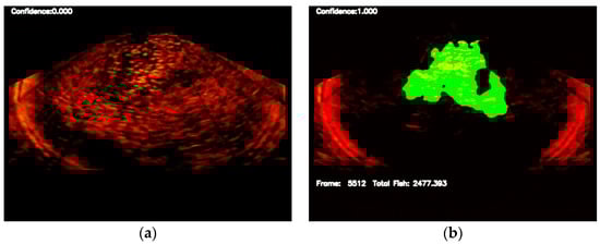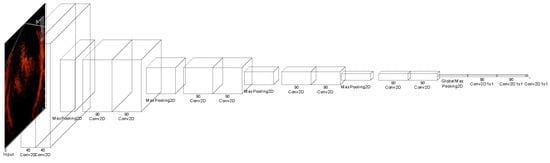 The pattern of the fish school in the sonar image when the fish gathers and swims toward the fish surface to grab the pellets is different compared with when the fish disperses, as shown in Figure 14. In this work, a CNN is first applied to find the frame in the sonar video where the fish school gathers and grabs the pellets. Then, the fish region in the said frame is identified using a semantic segmentation network; the details of these two neural networks will be presented later. The area of the bottom of the prism and the depth of the fish school can be estimated by: