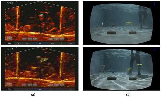 Brick detection and its corresponding four-point marks using YOLOv4 [55] in (a) sonar image and (b) stereo image pair.