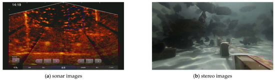 The stereo camera system has also been extensively used in computer vision. For example, a DeepVision stereo camera system was used by Rosen et al. [33] for continuous data collection of fish color images passing inside the extension of the trawl. Out of 1729 fish captured while trawling, 98% were identified in terms of species. Such a mechanism increases the scope of the information collected specifically on documenting the fine-scale distribution of individual fish and species overlap. The information that can be drawn from this can help interpret acoustic data. The underwater stereo video was also used to determine population counts and spatial and temporal frequencies, incorporating detection and identification [34]. Stereo vision is also integrated for video-based tracking [35], fish volume monitoring [36] or abundance [37], and 3D tracking of free-swimming fish [38].