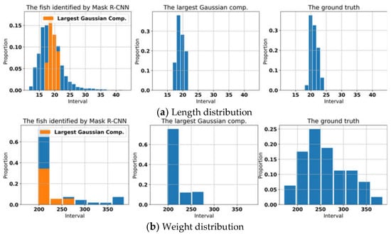 Furthermore, the response of the caudal fish fin in the sonar image is usually weak, which makes the fish length measured by our proposed method close to the standard length of the fish. On the other hand, the estimated weight distribution and the ground truth were significantly different. This result could be attributed to the fish’s weight being affected by other factors, such as the thickness of the fish. In practice, it is difficult to observe both the thickness and length of the fish instance from the view of the imaging sonar system. Overall, the relative error of the estimated average fish standard length was approximately 15%, while the relative error for the estimated average weight was less than 50%.