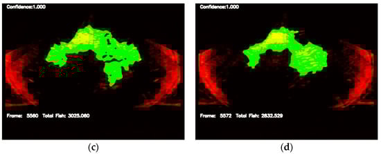 There are several ways to scan the fish school to estimate their volume using the sonar system. For example, it can rotate and sideway scan the fish school. In this paper, for simplicity purposes, the fish school was analyzed without rotating the sonar beam. The sonar beam in Figure 13a passes through the fish school in a slantwise position, where the angle between the sonar beam and the seaplane is . Meanwhile, in Figure 13b, the space of the fish school when the fish is grabbing pellets is enclosed by an irregular prism, and the volume of the fish school is estimated by the volume of its irregular prism and can be expressed as: