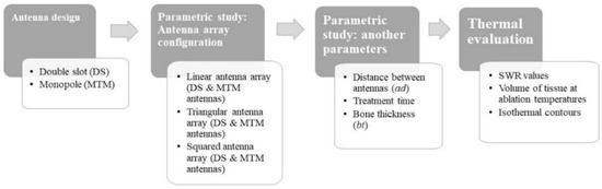 Lately, researchers at the National Institute of Rehabilitation Luis Guillermo Ibarra Ibarra (INR-LGII) started developing micro-coaxial antennas that were designed to specifically treat bone tissue by MWA [12,13,14,15,16,17]. Trujillo-Romero et al. firstly designed a single slot antenna to treat bone tumors [15]. A double slot (DS) antenna was also designed for the same purpose; it was modeled, built, and characterized in ex vivo porcine bone. The results showed ablation temperatures (60–100 °C) are reached by applying 10 W per 10 min; moreover, the maximum standing wave ratio (SWR) was 1.8 [16]. Although both antennas were effective in treating bone tissue, their diameter (1.19 mm) allows its deformation. This effect could reduce the antenna lifetime and affect its performance after just a few uses. Therefore, a new set of four different micro-coaxial antennas with a thicker diameter (2.19 mm) was proposed [17]. The antennas were modeled, built, and tested by using phantoms and ex vivo porcine tissue. The antennas showed SWR values lower than 1.7; moreover, just 5 W were applied during 5 min to reach ablation temperatures (60–100 °C). The reduction of input power levels had been possible due to the optimization process of our antennas This process allows to improve the efficiency of the MW system; therefore, ablated temperatures are reached with lower levels of input power (less than 10 W) in a relatively short period of time (minutes). The proposed antennas can cover a tissue region of approximately 3 cm2. However, according to the pathological stage of cancer, bone tumors at stage T1 can reach no more than 8 cm, while at T2 can be greater than 8 cm wide [18]. This region dimension cannot be covered by using a single micro-coaxial antenna, then, either multiple antenna insertions or a multi-antenna system must be used. The literature reports that some studies were carried out to evaluate multi-antenna arrays; however, most of these studies were implemented in liver tissue [19,20,21,22]. Karampatzakis et. al. reported a study that was performed to evaluate the heating characteristics of antenna arrays by using computational modeling [23]. However, in this study the use of triangular and square configurations of double slot (DS) antenna arrays to treat liver tumors was proposed; additionally, a brief analysis of some other tissues, including bone, were also implemented. Furthermore, to our knowledge, our study is the first one completely focused on evaluating the effect of using multi-antenna arrays to treat bone cancer. Therefore, the goal of this work was to evaluate the thermal behavior of different micro-coaxial antenna arrays that were proposed to treat bone cancer by MWA. Our hypothesis is that by using micro-coaxial antenna arrays, it is possible to increase the volume of the treated tumor; moreover, by using different antenna types and treatment time, different shapes of the ablation zones can be generated. The micro-coaxial antennas that were included in the study were the double slot (DS) and the monopole (MTM) antenna. A 3D parametric computational study that was based on the finite element method was proposed. The antenna arrays of two (linear), three (triangular), and four (square) antennas were analyzed. Several scenarios considering relevant parameters such as distance between the antennas (ad) and bone thickness (bt) were evaluated. In order to estimate the thermal effect over the tissues, SWR (standing wave ratio) values, maximum temperatures reached, the volume of tissue at the ablation temperatures, and the thermal distributions were analyzed.