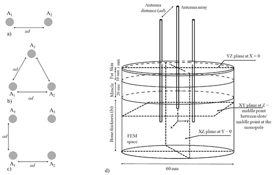 Figure 3d shows an example of a triangular configuration of antennas that was used to implement this study. Moreover, model dimensions, distance between antennas (ad), bone thickness (bt), and the axes of the observation planes that were used for the antenna performance evaluation, are represented.