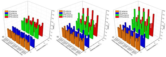SWR of the antennas that compose the analyzed antenna arrays. (a) linear antenna array, (b) triangular antenna array (SWR for A2 is within the values of A1 and A3), and (c) square antenna array (SWR for A2 and A4 is within the values of A1 and A3). DS = double slot antenna, MTM = monopole antenna; A1, A2, A3, and A4 correspond to the antenna number in each antenna array.