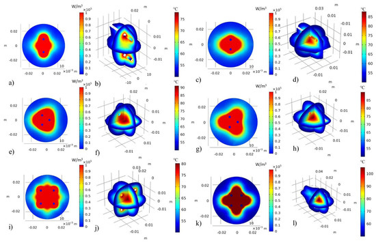 Distributions of the microwave heat source in the observation plane XY (W/cm3) and 3D views of the thermal distribution at temperatures higher than 50 °C. (a) heat source field for a linear array of doble slot antennas (ad = 15 mm and bt = 30 mm), (b) thermal distribution generated by the linear array of doble slot antennas ad = 15 mm and bt = 30 mm after 5 min, (c) heat source field for a linear array of monopole antennas (ad = 10 mm and bt = 40 mm), (d) thermal distribution generated by the linear array of monopole antennas (ad = 10 mm and bt = 40 mm) after 10 min, (e) heat source field for a triangular array of doble slot antennas (ad = 10 mm and bt = 40 mm), (f) thermal distribution generated by the triangular array of doble slot antennas (ad = 10 mm and bt = 40 mm) after 5 min, (g) heat source field for a triangular array of monopole antennas (ad = 10 mm and bt = 40 mm), (h) thermal distribution generated by the triangular array of monopole antennas (ad = 10 mm and bt = 40 mm) after 5 min, (i) heat source field for a square array of doble slot antennas (ad = 15 mm and bt = 40 mm), (j) thermal distribution generated by the square array of doble slot antennas (ad = 15 mm and bt = 40 mm) after 10 min, (k) heat source field for a square array of monopole antennas (ad = 10 mm and bt = 25 mm), (l) thermal distribution generated by the square array of monopole antennas (ad = 10 mm and bt = 25 mm) after 5 min.