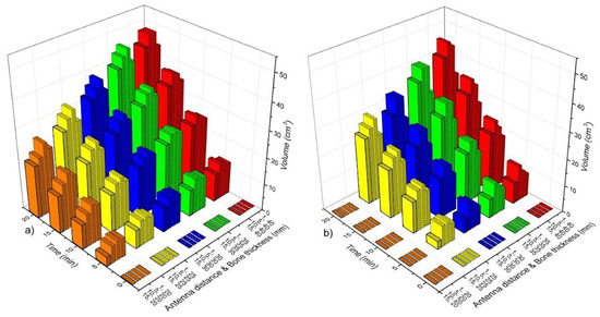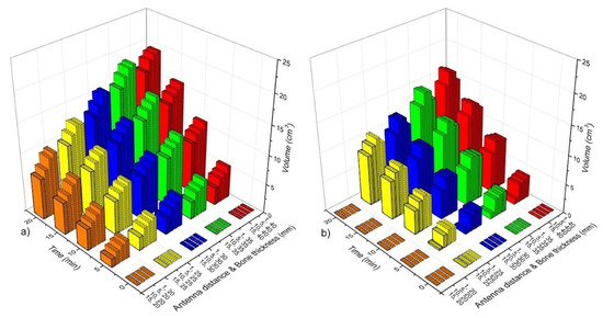 Figure 10 shows the volume of bone tissue at ablation temperatures that were reached by the square configuration. Figure 10a shows the volumes that were generated by the DS antenna array. According to the SWR values (See Figure 4c), cases corresponding to ad = 1 mm and bt = 20 mm–40 mm had SWR values that were higher than 2, which means that their performance is not highly effective. Nevertheless, if ad increases, lower SWR values are achieved (See Table 7). Moreover, the tissue volume at ablation temperatures also increases. The volume of bone at ablation temperatures goes from approximately 7 cm3 (5 min) to 44.5 cm3 (20 min). Although the bone volume at ablation temperatures can be up to 44.5 cm3, the temperature increase also affects muscle and fatty tissues. In the worst-case scenario, even muscle was more affected than bone tissue, i.e., the V_bone = 19.5 cm3, V_muscle = 25.33 cm3, and V_fat = 2.23 cm3 for ad = 15 mm and bt = 20 mm. On the other hand, the MTM antenna array reached lower temperatures. Moreover, just cases where ad = 10 mm and 15 mm and bt = 25 mm–40 mm showed SWR values ≤2 (See Table 7). Therefore, in these cases, the reached volumes of bone were from 7 cm3 (5 min) to 41 cm3 (20 min). In the worst-case scenario (ad = 15 mm and bt = 20 mm), V_bone = 24.87 cm3, V_muscle = 19.5 cm3, and V_fat = 0.37 cm3.