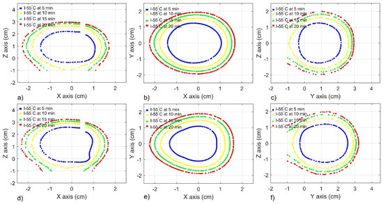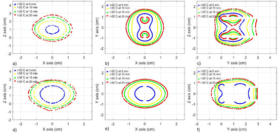 Isotherm contour at 55 °C that was generated by a square antenna array over different planes after 5 min, 10 min, 15 min, and 20 min of treatment time. (a–c) XZ, XY, and YZ planes for a DS antenna array with ad = 15 mm and bt = 40 mm, respectively; (d–f) XZ, XY, and YZ planes for a MTM antenna array with ad = 10 mm and bt = 25 mm, respectively.