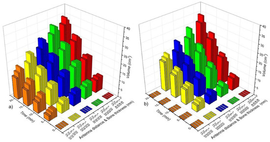 Bone tissue volume at ablation temperatures (T > 55 °C) as a function of time, antenna distance (ad), and bone thickness (bt). (a) Triangular array of DS antennas and (b) triangular array of MTM antennas.