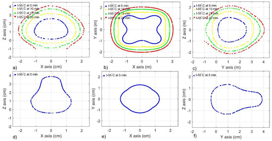 Isotherm contour at 55 °C generated by a triangular antenna array over different planes after 5 min, 10 min, 15 min, and 20 min of treatment time. (a–c) XZ, XY, and YZ planes for a DS antenna array with ad = 10 mm and bt = 40 mm, respectively (d–f) XZ, XY, and YZ planes for a MTM antenna array with ad = 10 mm and bt = 40 mm, respectively.