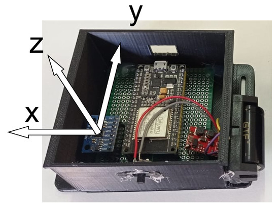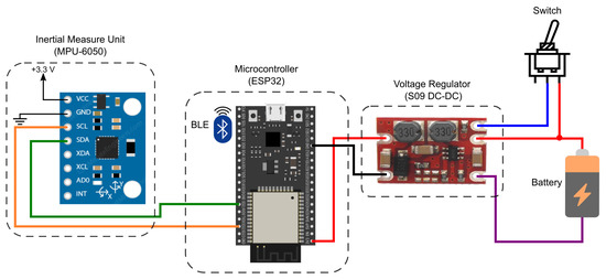 To take advantage of the functionalities available in the MPU-6050, an architecture based on the ESP32 Microcontroller Unit (MCU) was designed, as illustrated in Figure 1. The proposed module comprises a battery, a DC–DC voltage regulator, MCU, and the IMU sensor. The employed source was a conventional 3.7 V 700 mA h lithium-ion battery. The voltage regulator used was the S09 model due to its low cost and output voltage level, which allows an input voltage of (3–15) V, output voltages of 3.3 V/4.2 V/5.0 V/9.0 V/12.0 V, and maximum output current of 0.6 A. The MCU was selected as the ESP32 due to its low cost and the availability of wireless communication protocols (Wi-Fi and BLE), which provide the I2C bus to collect the acquired data from the MPU-6050 and sends the collected data through BLE to a mobile application.
