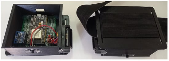 From the defined scheme, the electronic components were soldered on a universal perforated board and fixed with hot glue in a case developed in a 3D printer. The case illustrated in Figure 2 was designed to protect the electronic components and provide a way to tie the wearable system to a surface, such as a person’s thigh. Thus, to keep the case stable in the desired location, it has made two gaps on each side of the case, making it possible to pass clothing elastics and make a knot.