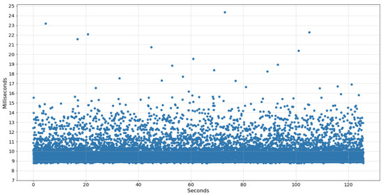Given this, the data acquisition of the IMU sensor was implemented in a thread programmed to collect a sample every 8 ms, ideally resulting in a sampling frequency of 125 Hz. However, due to the sharing of processing power with the other tasks, the data collected showed acquisitions of 99–100 Hz. Furthermore, the average time interval between each collection was 9.8 ms, with some peaks above 24 ms. The chart in Figure 3 displays the time difference between each sample collected by the wearable system in an example of an acquisition performed.