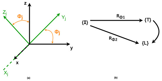 To map a frame worth in respect to another in the case of rotations in the YZ-plane of an angle around the x-axis, as presented in Figure 5, the Euler angles are determined by applying the linear mapping successively from rotation matrices ( and ) in each of these spaces. The rotation matrix is given by Equation (1), where or :