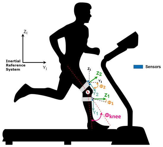 Once the IMU’s data are measured with respect to the inertial coordinate system, the attachment of an IMU to each body permits the determination of their orientation naturally with respect to the inertial system, and the difference between them gives the knee angle.