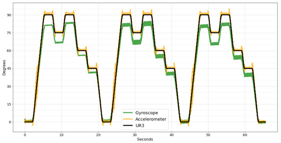 As can be seen in Figure 10, both sensors, gyroscope, and accelerometer can reproduce the movement performed by the UR3, but they are inaccurate. As the accelerometer can better measure slow movements, the error is small during continuous movements, as shown in Figure 10 in the range of motion from 0° to 90°. However, when the UR3 stops, the accelerometer takes time to stabilize, generating noise peaks.