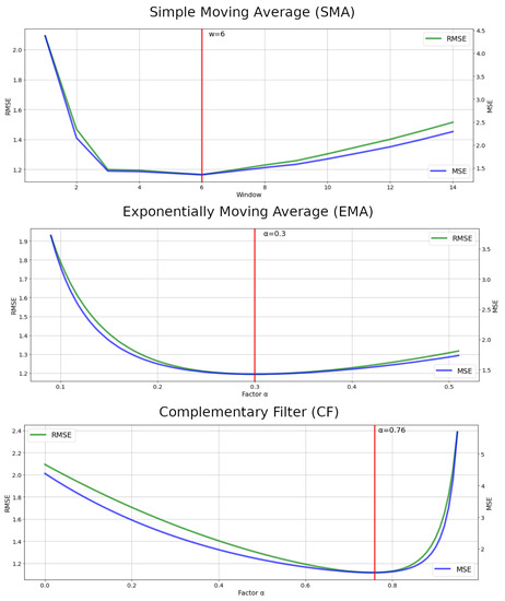 The red vertical lines in Figure 11 show the optimal points for each parameter defined by the lowest RMSE and MSE values. With this, it is possible to find out which of the selected filters had the smallest error in measuring the movement of the UR3 robot. Table 1 displays the calculated values of the evaluation metrics for the wearable system’s raw data and the three filters applied SMA, EMA, and CF.