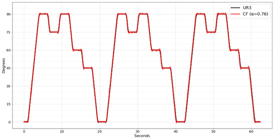 Figure 12 shows the movement recognized by the wearable system with the CF filter already implemented. Analyzing the new data, it was noticed that the performance of the CF filter was even better, resulting in 0.6 degrees on MAE, 1.0058 on MSE, meaning a 77% improvement, and 1.0029 on RMSE, meaning a 52% improvement.