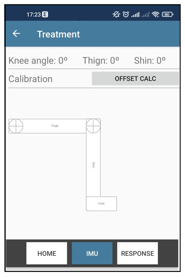 The recognition of the knee angle will be an asset for the myHealth app, as its objective is to enable performing a treatment with electrostimulation at the patient’s home. For this purpose, an interface was developed to show a sketch of the patient’s leg with its components. As soon as myHealth receives new data from the wearable system, the leg representation is recalculated according to the recognized movement, and a fresh sketch is redrawn, exhibiting the patient’s response to the stimuli.