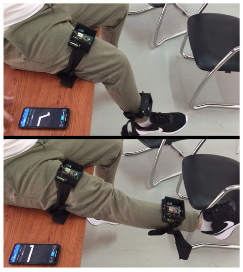 The wearable module systems were applied to a real environment to validate the developed content. Five volunteers were recruited to perform a test performing the knee extension movement. In this test, each volunteer remained seated on a bench and was requested to lift their leg five times for one minute, keeping their leg raised for approximately 4 s each time in the maximum muscle contraction.